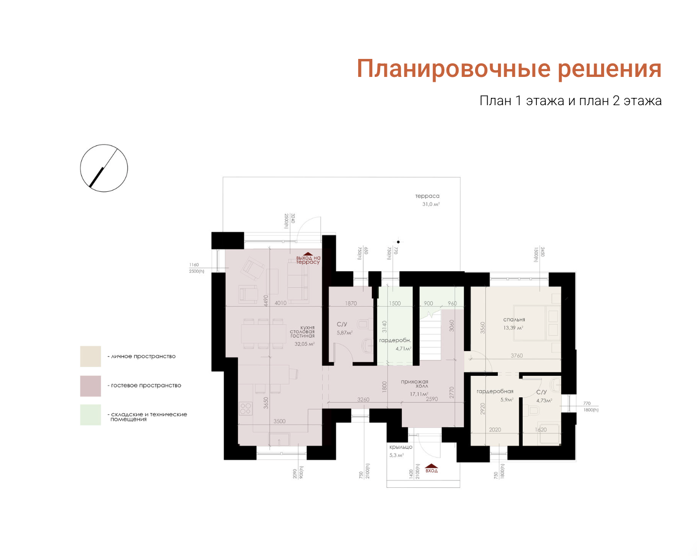 На первом этаже размещена гостевая зона и блок спальни для старшего поколения.