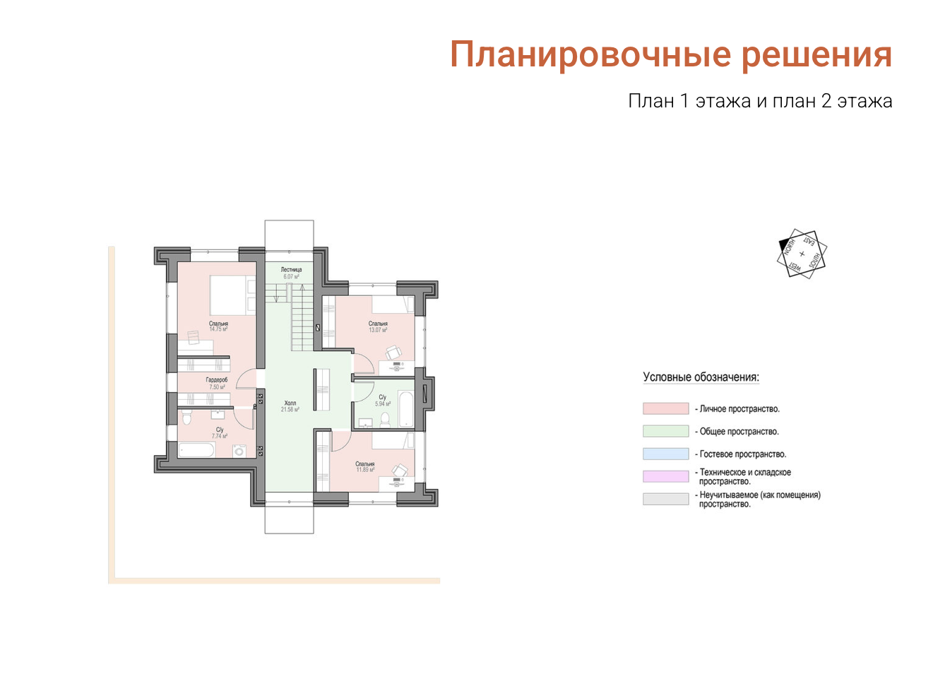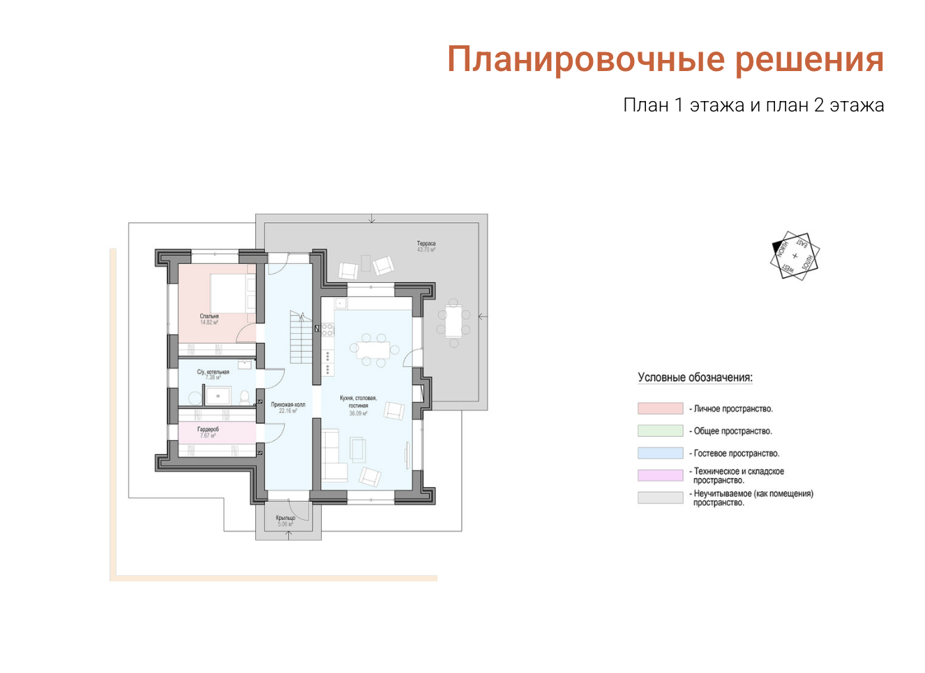 Внутреннее пространство дома тоже классически разделено на две основные зоны: