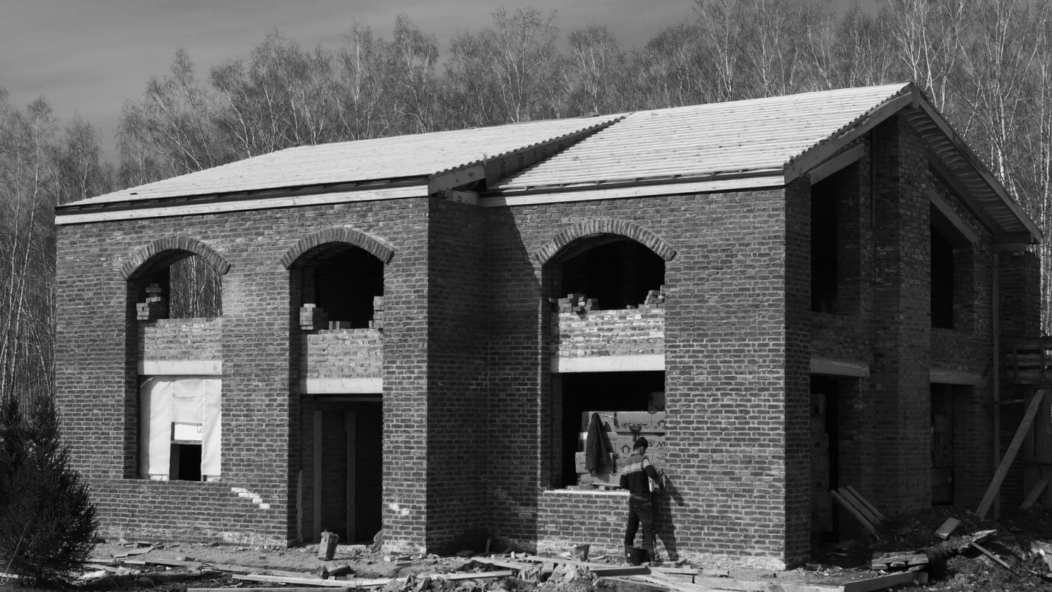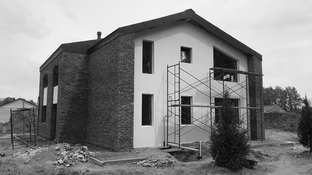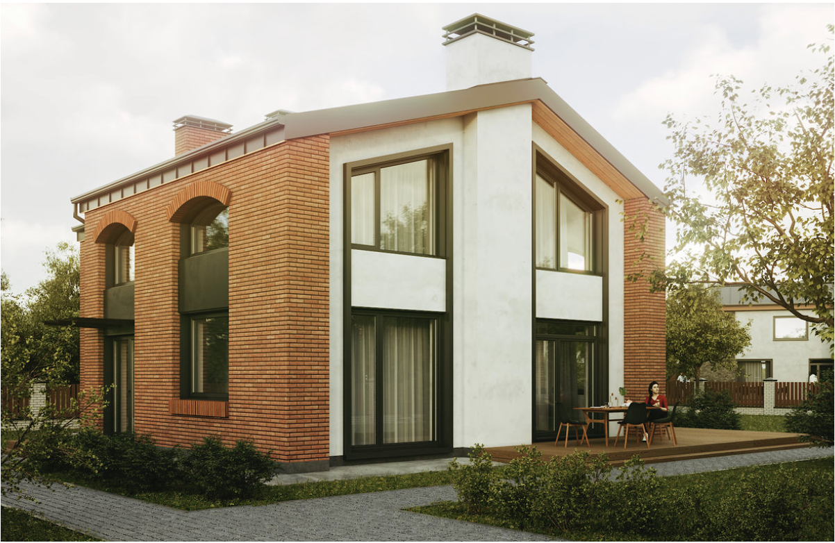 Минималистичные штукатурные фасады с крупноформатным остеклением - современное решение, которому противопоставляются классический кирпич ручного формования и арочные оконные проемы.