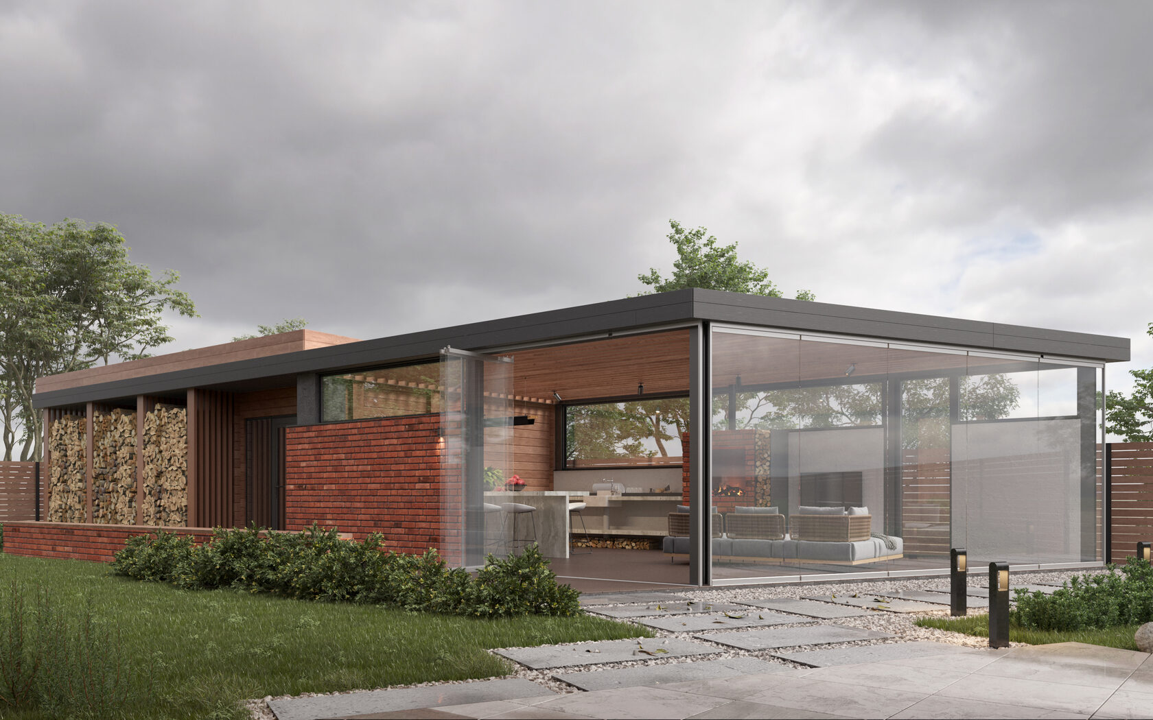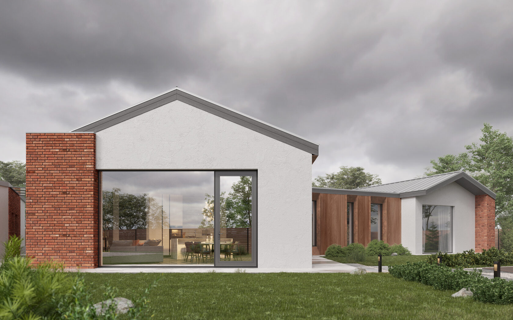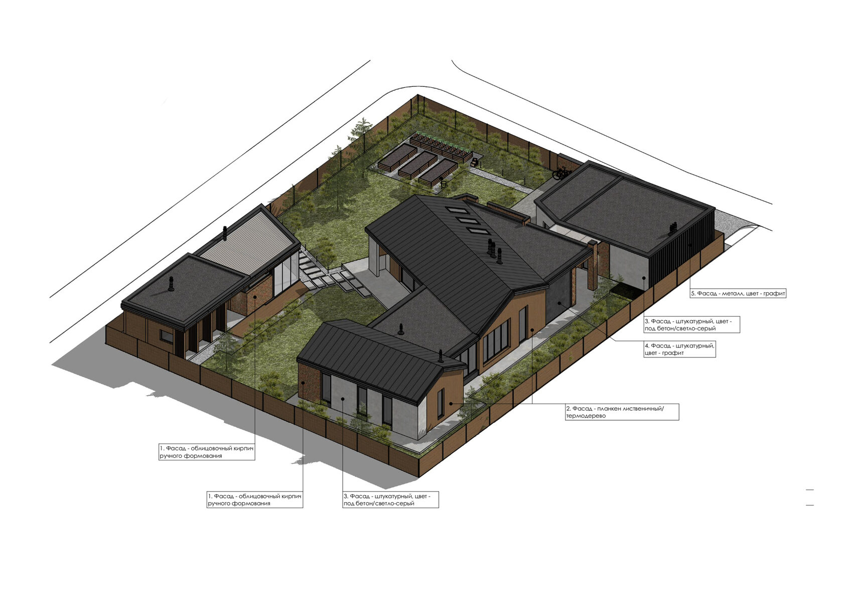 Кровля дома двускатная с фрагментами плоской. Фасады - комбинированные: кирпич ручной формовки, планкен, штукатурный фасад и металлические фрагменты.