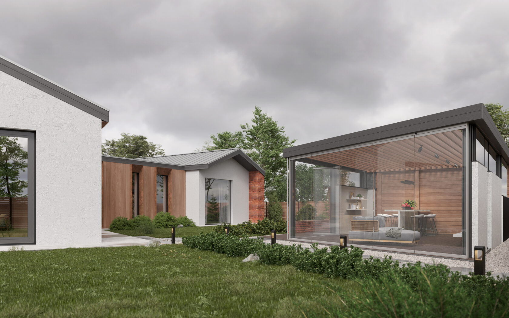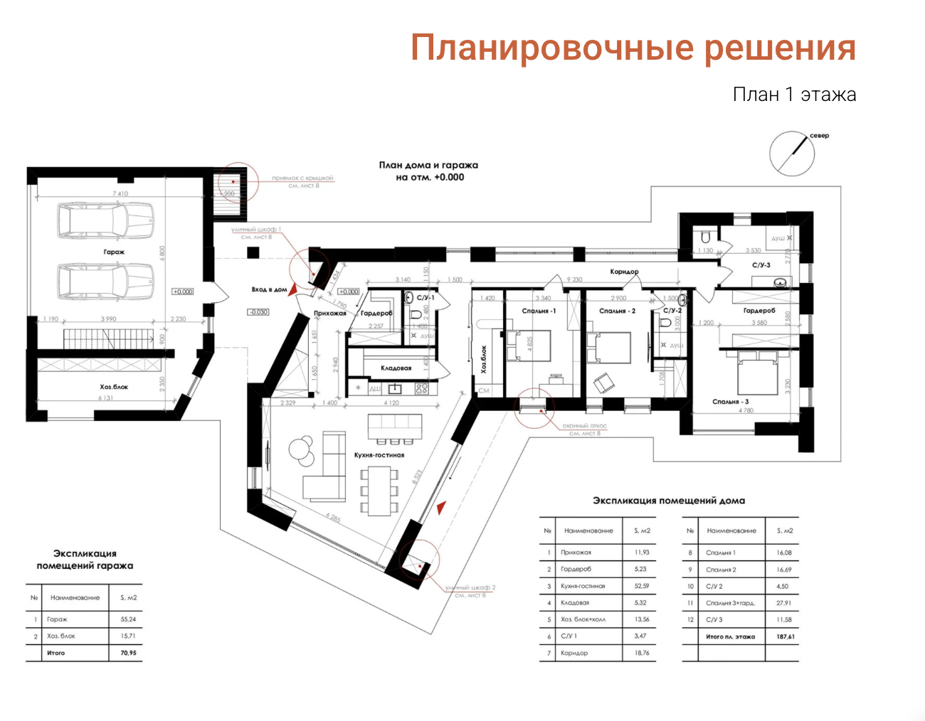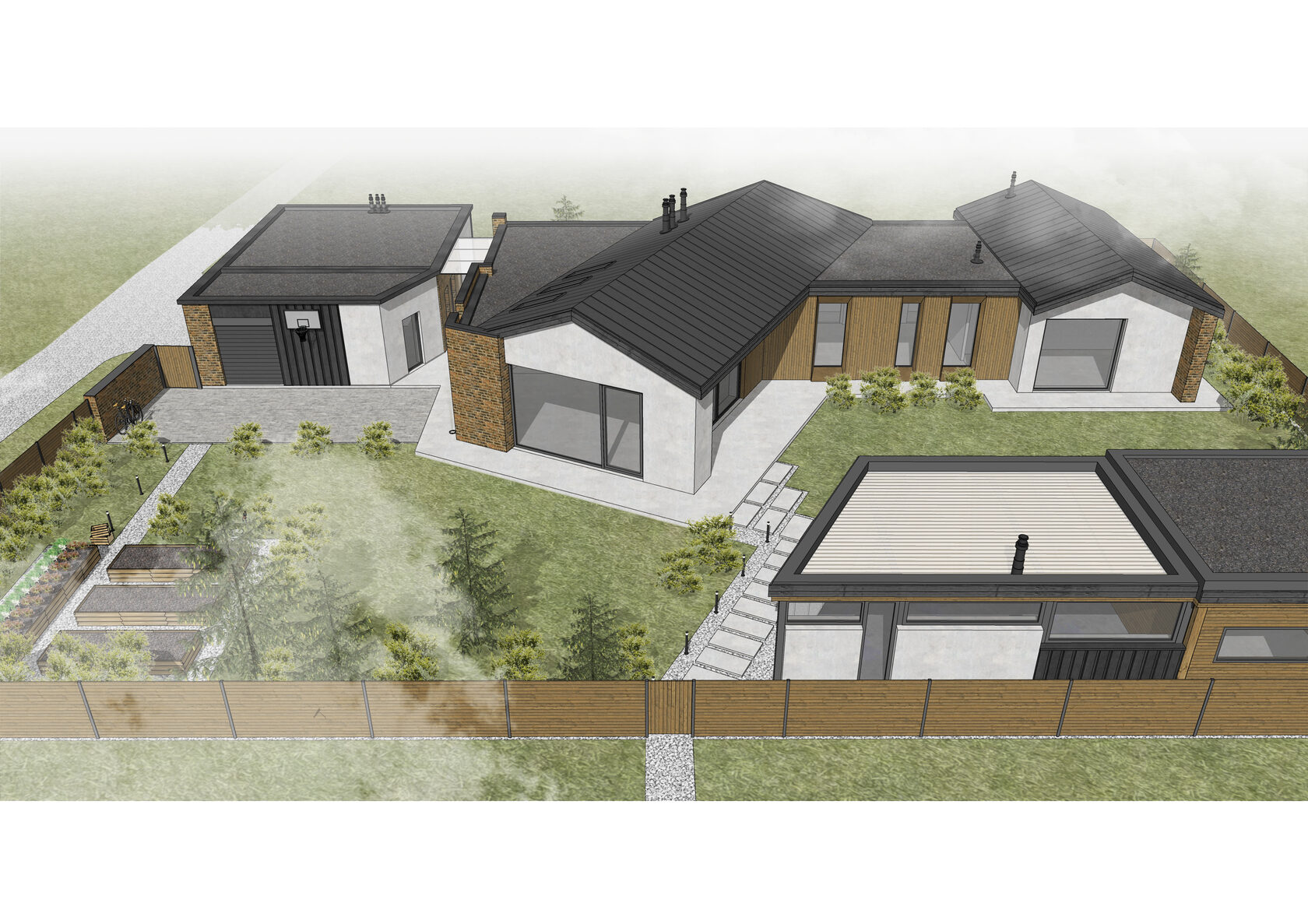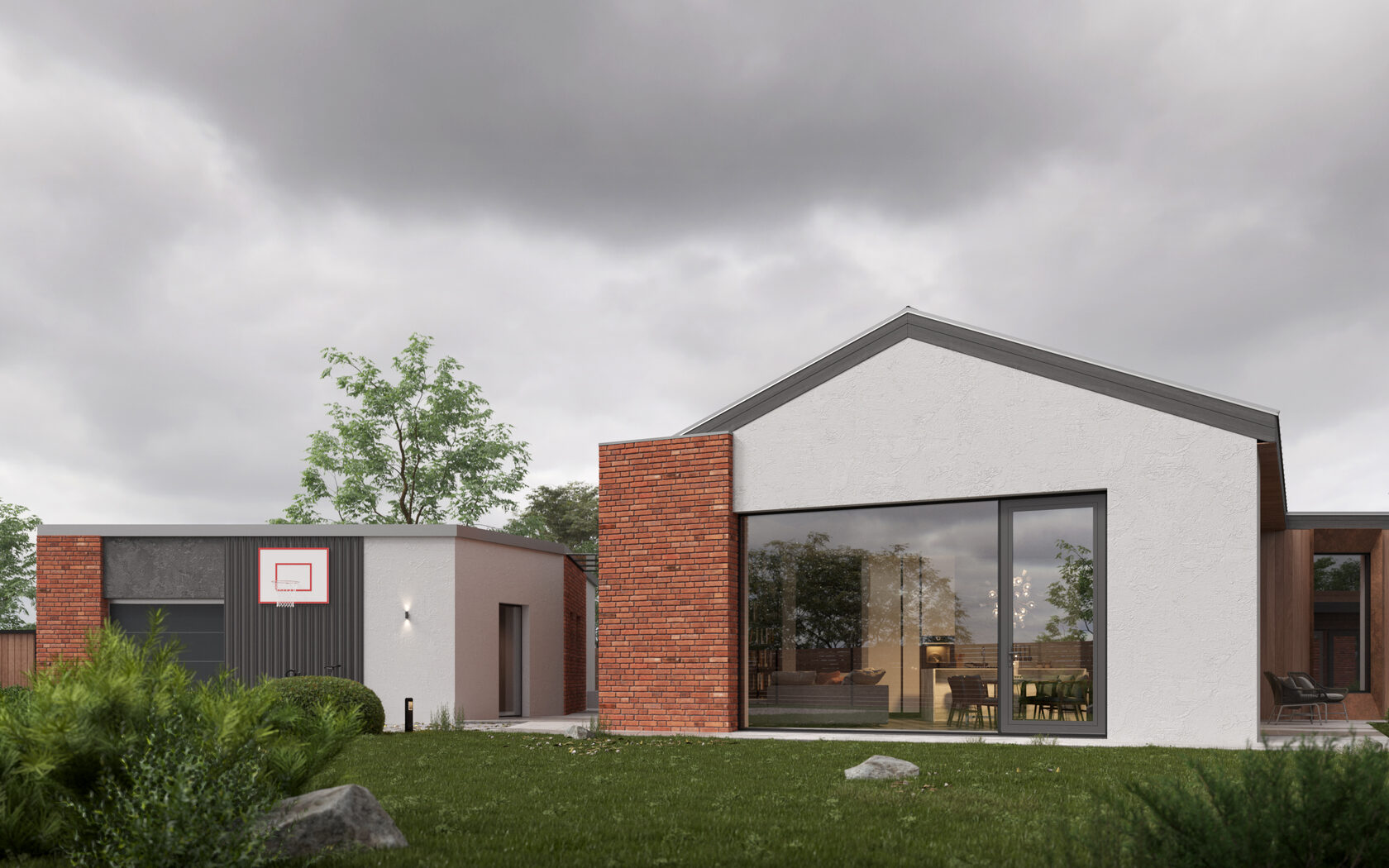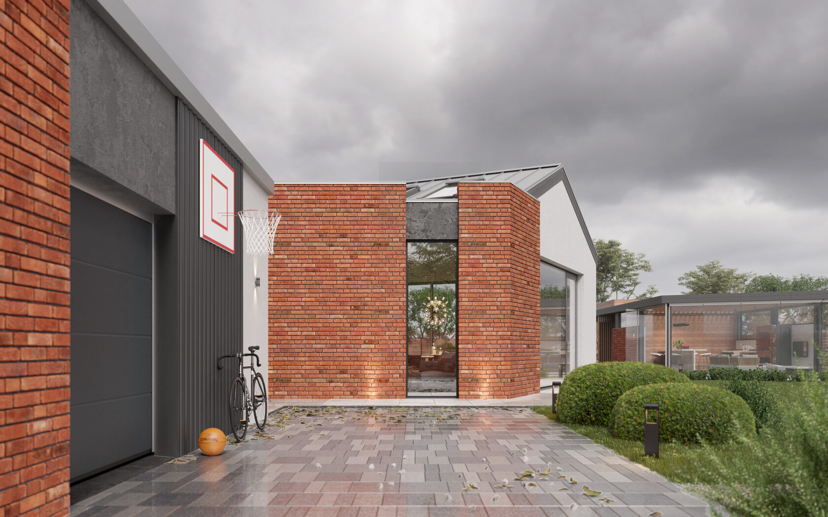 На участке спроектированы: индивидуальный жилой дом, гараж для двух машиномест с хоз. помещением и подвалом, блок с баней и остекленной террасой. Участок разделен на несколько зон: въездная и входная зона, спорт-зона у гаража, зона коннектора между домом и гаражом, зона посадок, огорода и внутренний двор - зона отдыха.